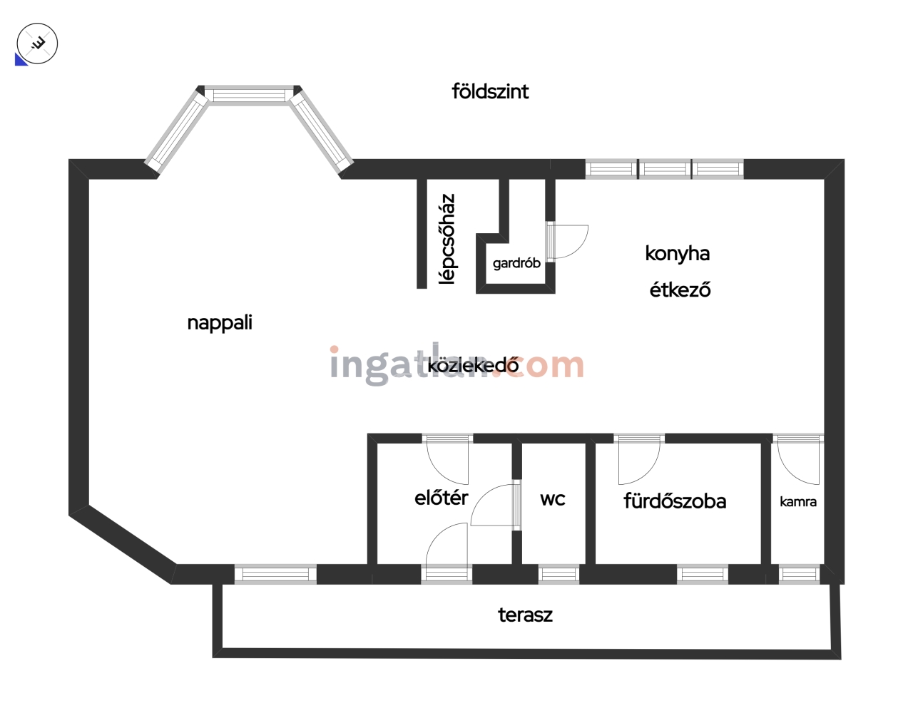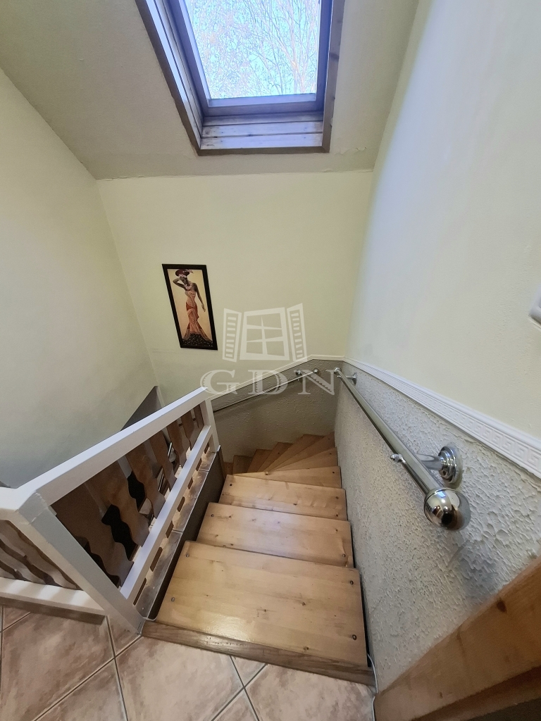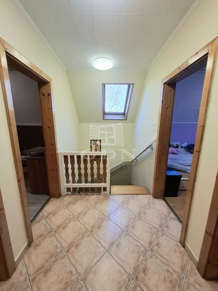 Helyiségei: földszinten előtér, nappali, konyha/étkező, kamra, zuhanyzós fürdőszoba, közlekedő, lépcső alatt gardrób wc.