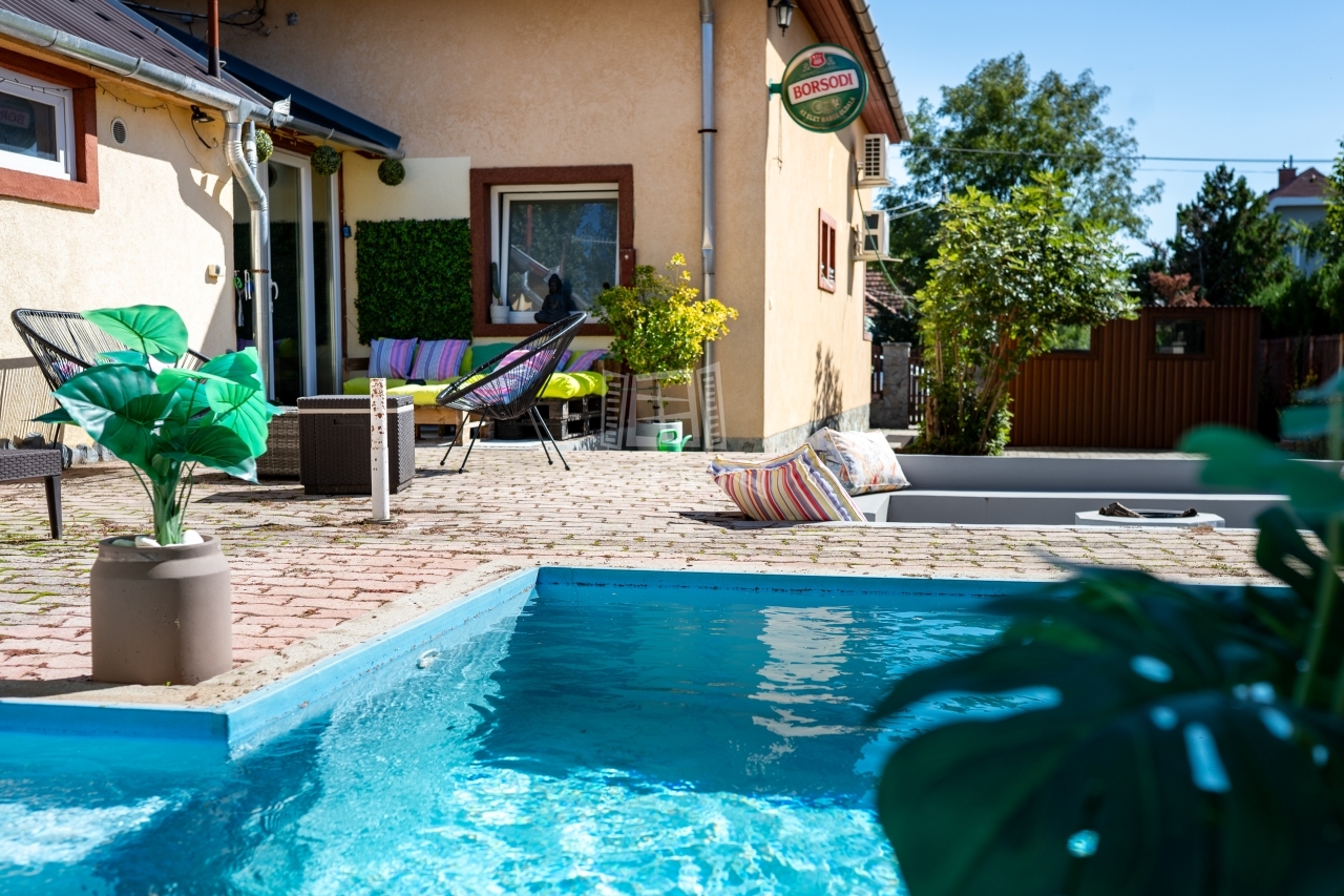 A pihenést és kikapcsolódást szolgálja a medence és a süllyesztett kerti sütögető, amely körül 12 fő is kényelmesen elfér.