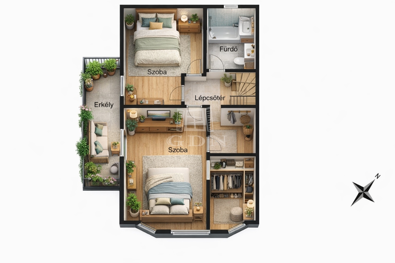 Elrendezés: nappali + 2 hálószoba + 1 gardróbszoba