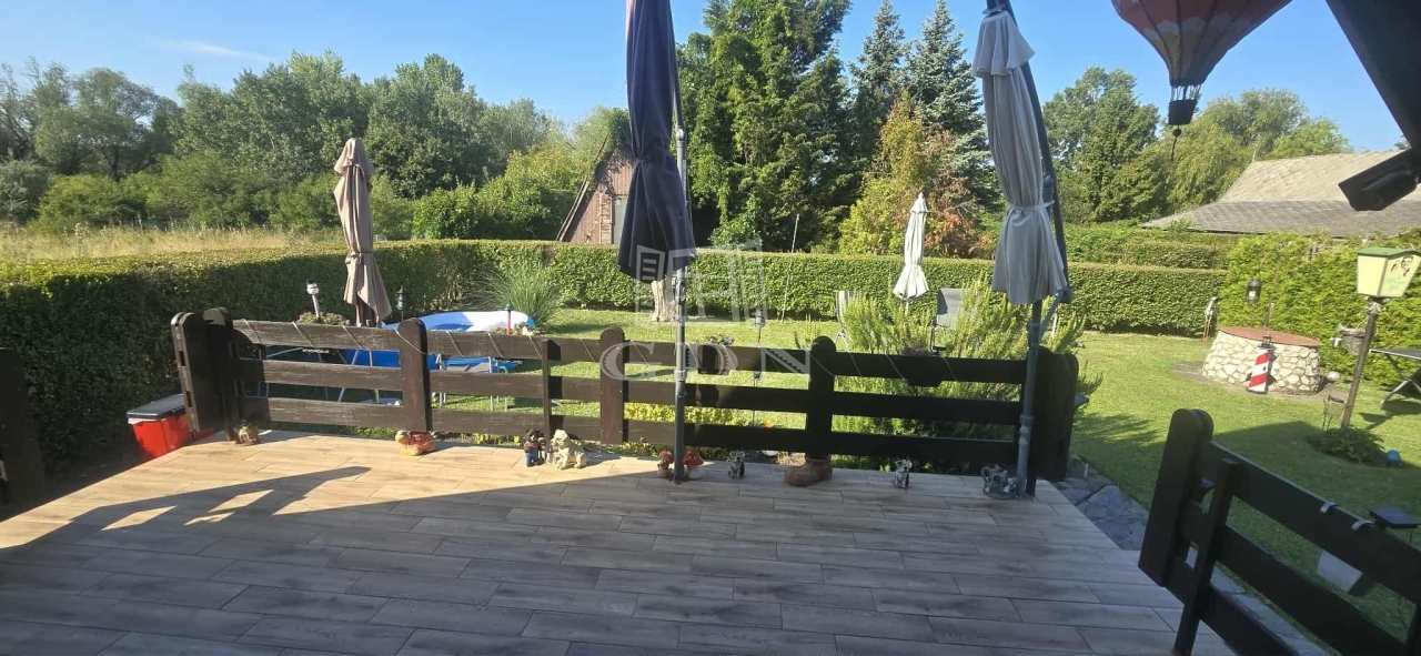 - A kert igényesen gondozott, körben élő sövény és fa kerítés biztosítja a meghitt privát teret.