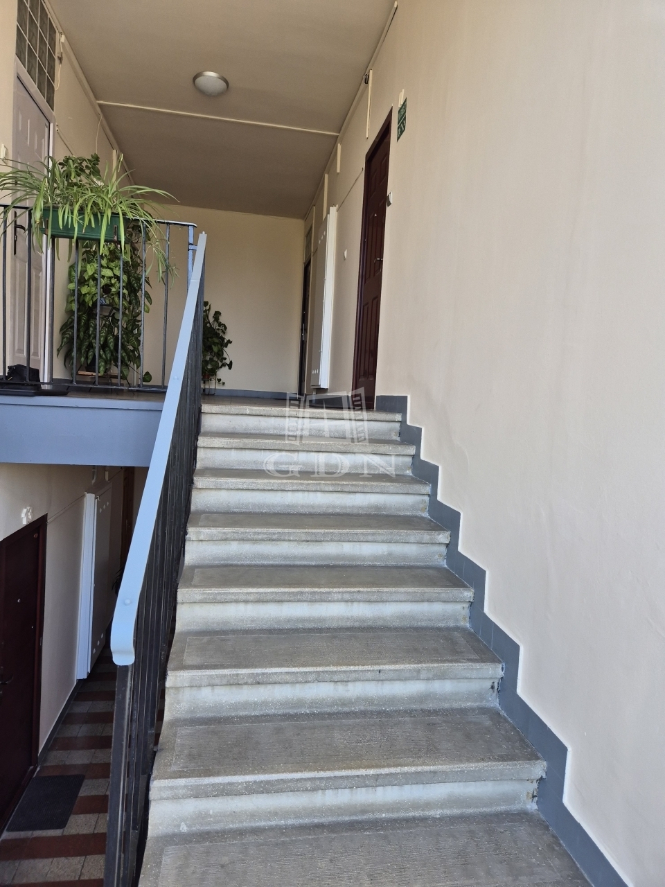 A lépcsőház frissen festett, rendezett, a lakóközösség kulturált és barátságos.