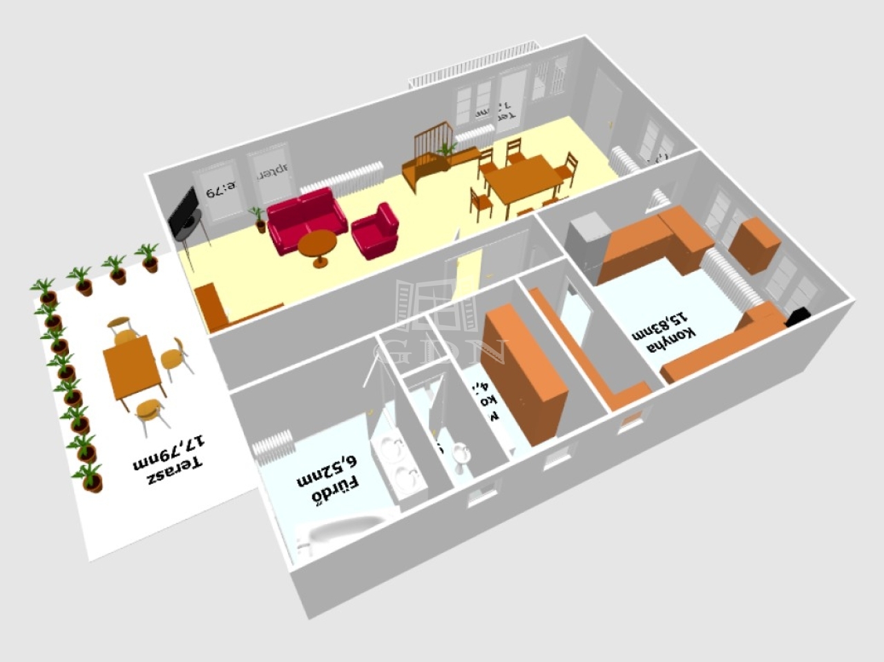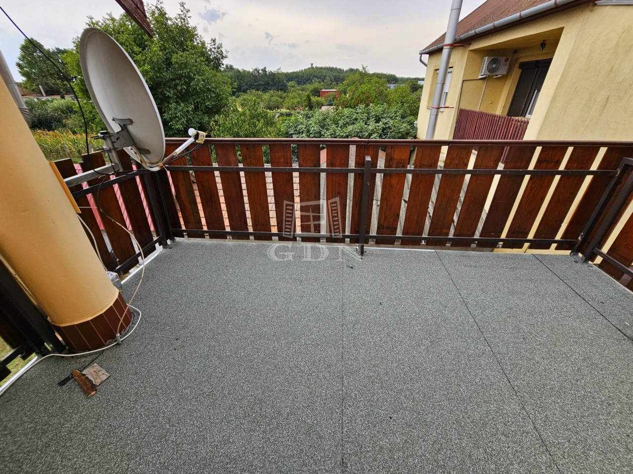 A konyha világos, elegáns kivitelű, praktikusan elrendezett, teljesen gépesített, az étkezővel átadó pulttal is össze van kötve. Az étkezőrész és a nappali tágas, a rajta található tolóajtón keresztül a nagy teraszra is ki lehet ülni.