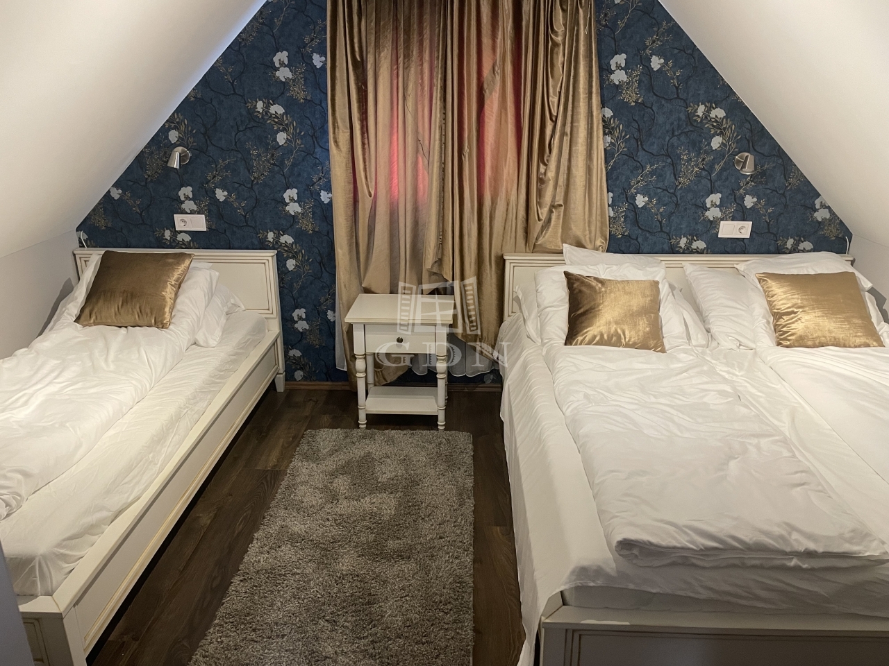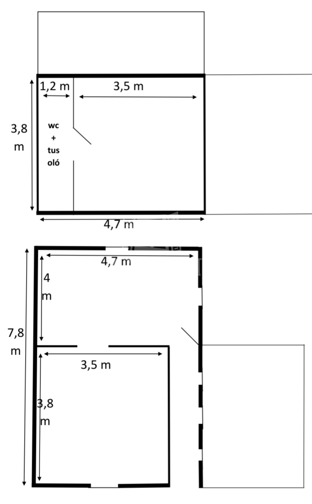 Emelet: hálószoba (1 franciaágy + 1 egyszemélyes ágy), fürdőszoba, valamint az előtérben egy kihúzható vendégágy,