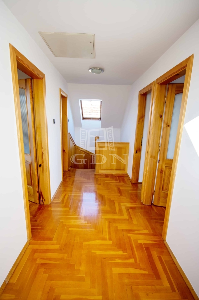 A földszinten konyha, egy hálószoba és fürdőszoba, míg az emeleten három szoba és fürdőszoba került kialakításra. Mindkét szinten terasz, a legalsó szinten pedig pince található. Az épülethez garázs is tartozik.