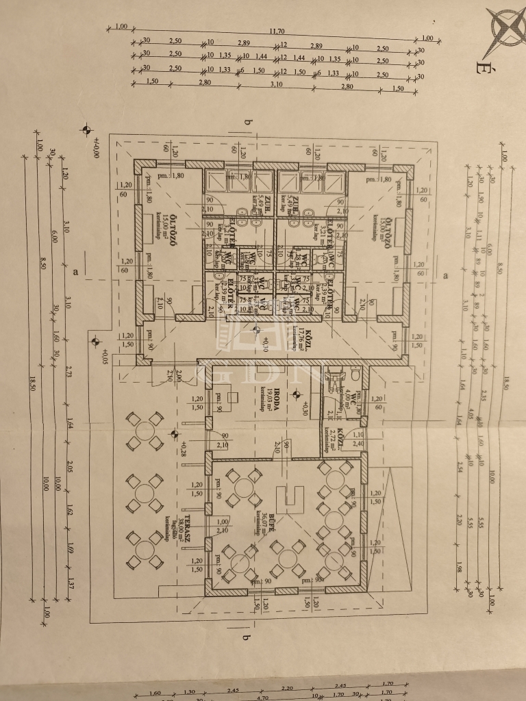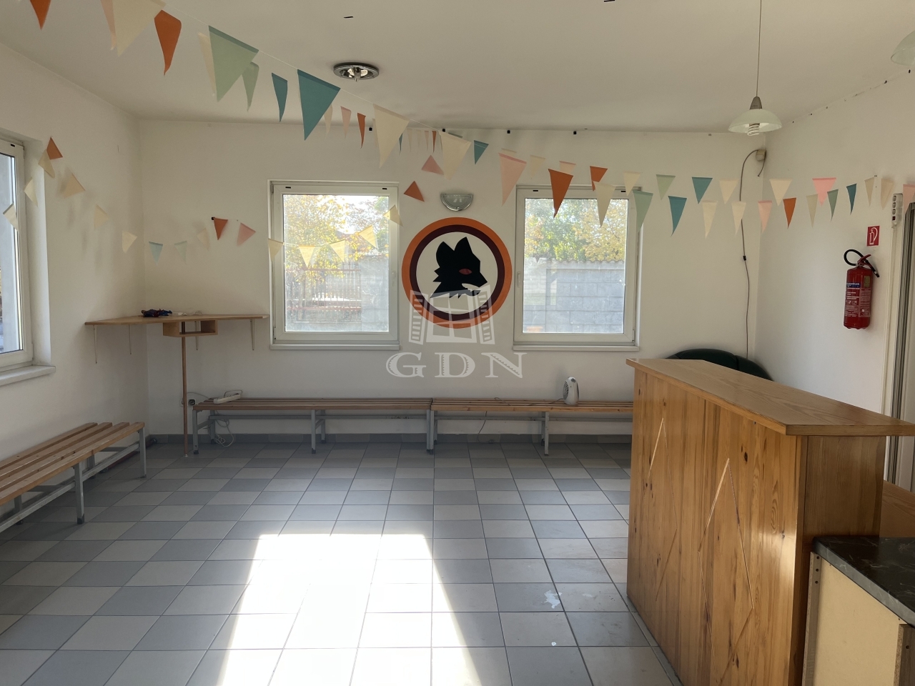 A kiszolgáló épületben (198 nm) recepció, büfé, öltözők, zuhanyzók, mosdók, terasz állnak rendelkezésre.