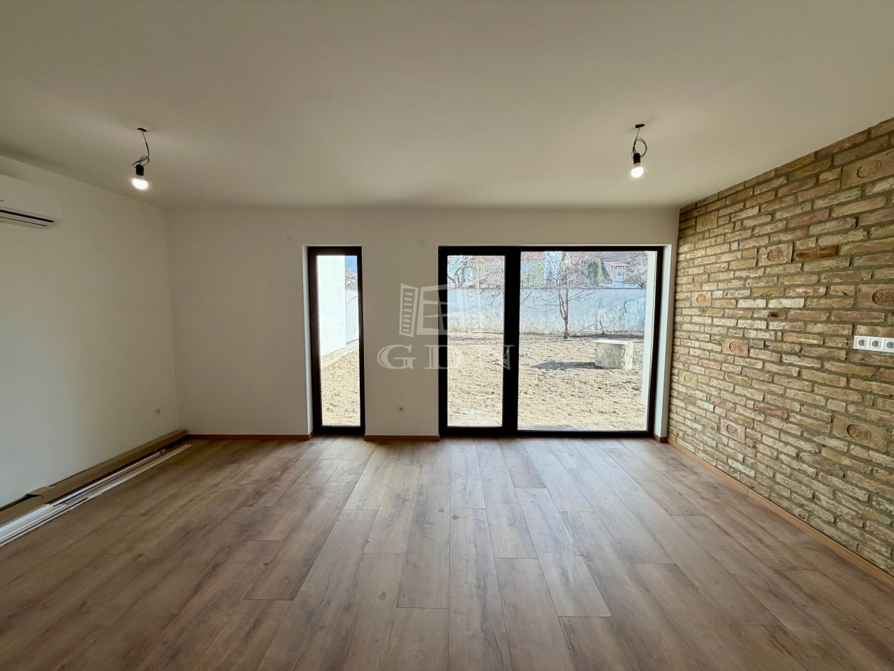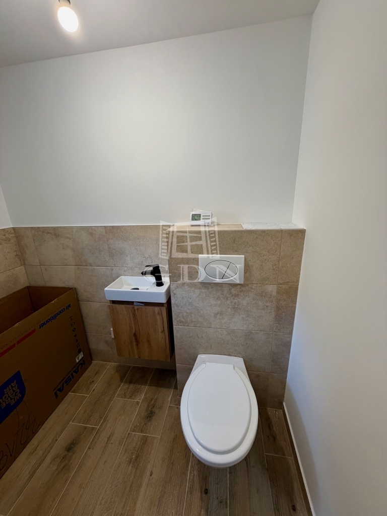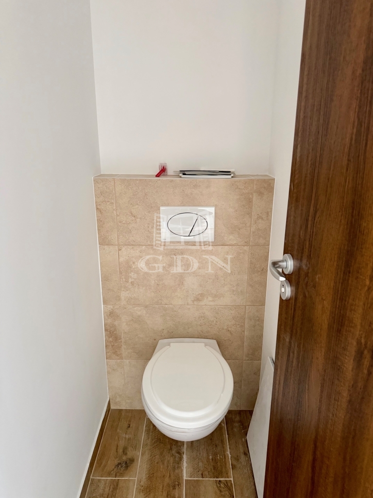 Az alsó szinten egy tágas, napfényes amerikai konyhás nappali kapott helyet, közvetlen kijárattal a kb. 90 m²-es saját kertbe, valamint egy vendégmosdó és egy tároló.